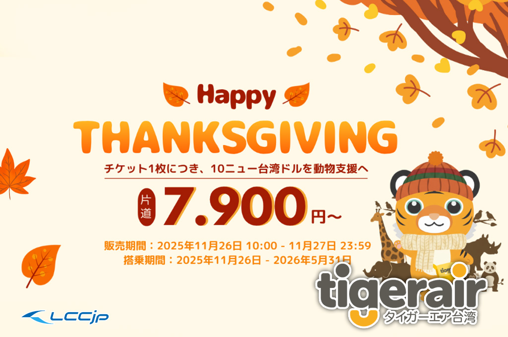 タイガーエア台湾、「サンクスギビングデーセール」11月26日10時から開催!台湾国際線 片道7,900円から